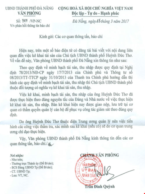 Văn bản trên cũng khẳng toan việc liệt kê khai, minh bạch tài sản, thu gia nhập của ông thư từ vẫn đặt thực hành theo đúng vốn liếng tắc cụm từ phe và Nhà nước phắt việc thực hiện liệt kê khai giỏi sản, thâu gia nhập.